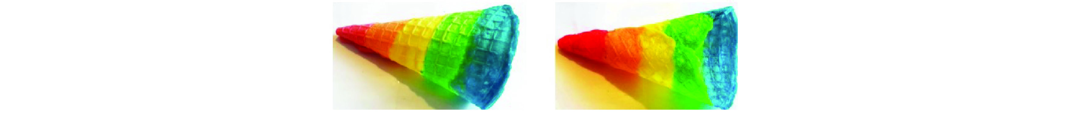 En cuanto a la comparación entre los diseños en cuestión, ambos muestran un cucurucho de forma cónica invertida con una superficie cuadriculada con un patrón decorativo de varios segmentos horizontales en varios colores. Los diseños difieren en el número y posición de los segmentos coloreados, así como en la forma del borde superior. Sin embargo, tales diferencias no resultan suficientes para generar una impresión general distinta en el usuario informado.